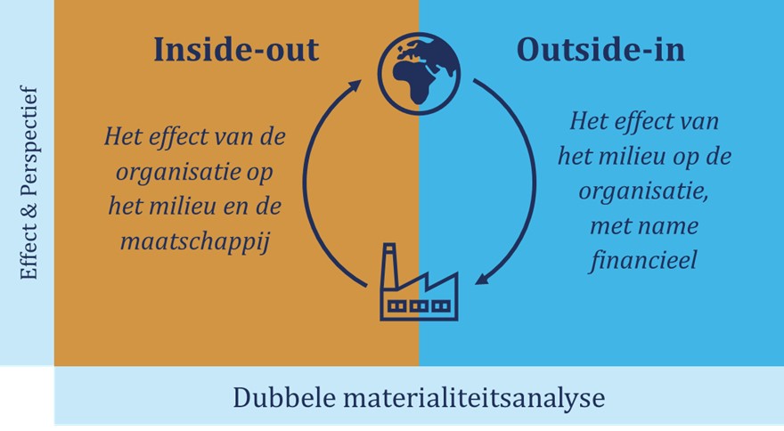 Dubbele materialiteit (ofwel relevantie, significantie) werkt twee kanten op (zie figuur). Enerzijds betreft het de mogelijke positieve en negatieve (materiële) impact van de organisatie op het milieu (bijvoorbeeld door bij te dragen aan de energietransitie) en de maatschappij (bijvoorbeeld door het verminderen van armoede): het inside-out perspectief. Anderzijds gaat het over het materiële effect van duurzaamheidsgerelateerde risico’s (zoals water- of droogteschade) en kansen voor de organisatie (financieel van aard): het outside-in perspectief.