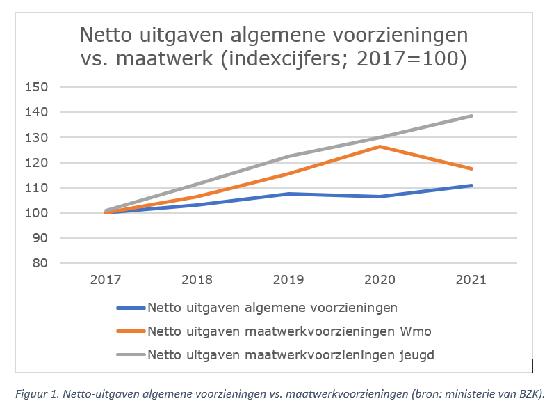Nederlandse gemeenten zijn weliswaar in de periode 2017-2021 meer gaan uitgeven aan algemene voorzieningen, maar de netto-uitgaven voor maatwerkvoorzieningen Wmo en jeugd zijn in dezelfde periode veel harder gestegen. In totaal besteedden Nederlandse gemeenten in 2021 € 10,6 miljard aan maatwerkvoorzieningen in de Wmo en Jeugdwet, terwijl de investeringen in algemene voorzieningen slechts € 1,9 miljard bedroegen.